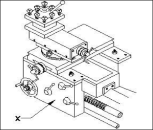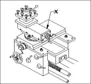 : What is the name of the part marked ‘X’ in the lathe carriage?